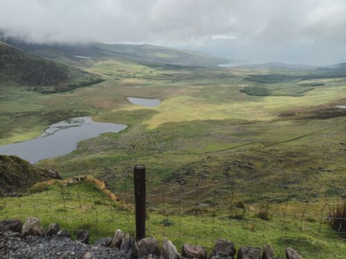 Dix kilomètres de route nationale pour commencer : ce n’est pas drôle et c’est dangereux. Nous avons fait un petit écart plus proche de la mer pour respirer un peu et nous avons retrouvé vite de beaux espaces naturels. Ensuite c’était l’ascension du col Conor (410 m, un des plus hauts irlandais) d’altitude. Ça paraît ridicule mais quand on le monte face au vent sous des averses et dans la brume, ça fait un tout autre effet. On se croirait à la montagne. Une petite éclaircie au col pour apprécier. La descente vers Dingle était facile mais nous sommes arrivés transis à notre gîte.
